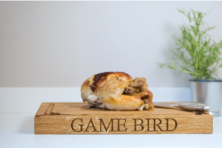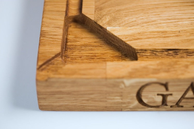This Standard Oak Carving Board is perfect for any roast joint. The practical hand carved gully catches meat juices, saving your work top from greasy spills. This board makes a fabulous personalised oak gift for that "special person" or "persons" to mark their wonderful day, special occasion or milestone birthday.