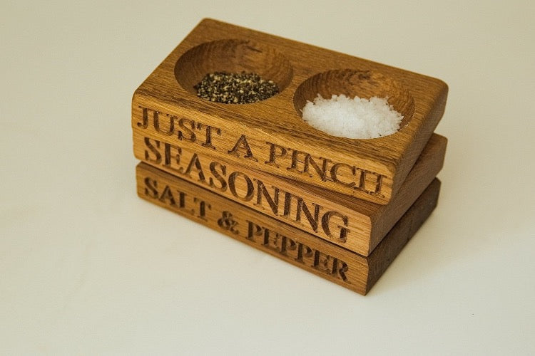 The pinch pot is made from solid oak and can be left blank, be personalised or you can choose from one of our old favourites....Just A Pinch and Salt & Pepper.