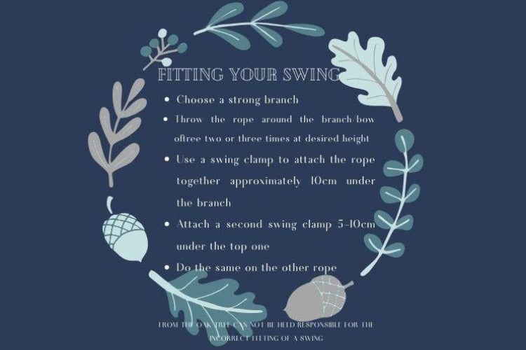 NOTE: It is the customers responsibility to hang the swing correctly. Please ensure that you have fixed the rope and swing safety and securely from a tree or swing frame before you attempt to swing on it. From the oak Tree can not take responsibility for poor fitting. Please keep an eye on the ropes as they are natural and will whether and wear.