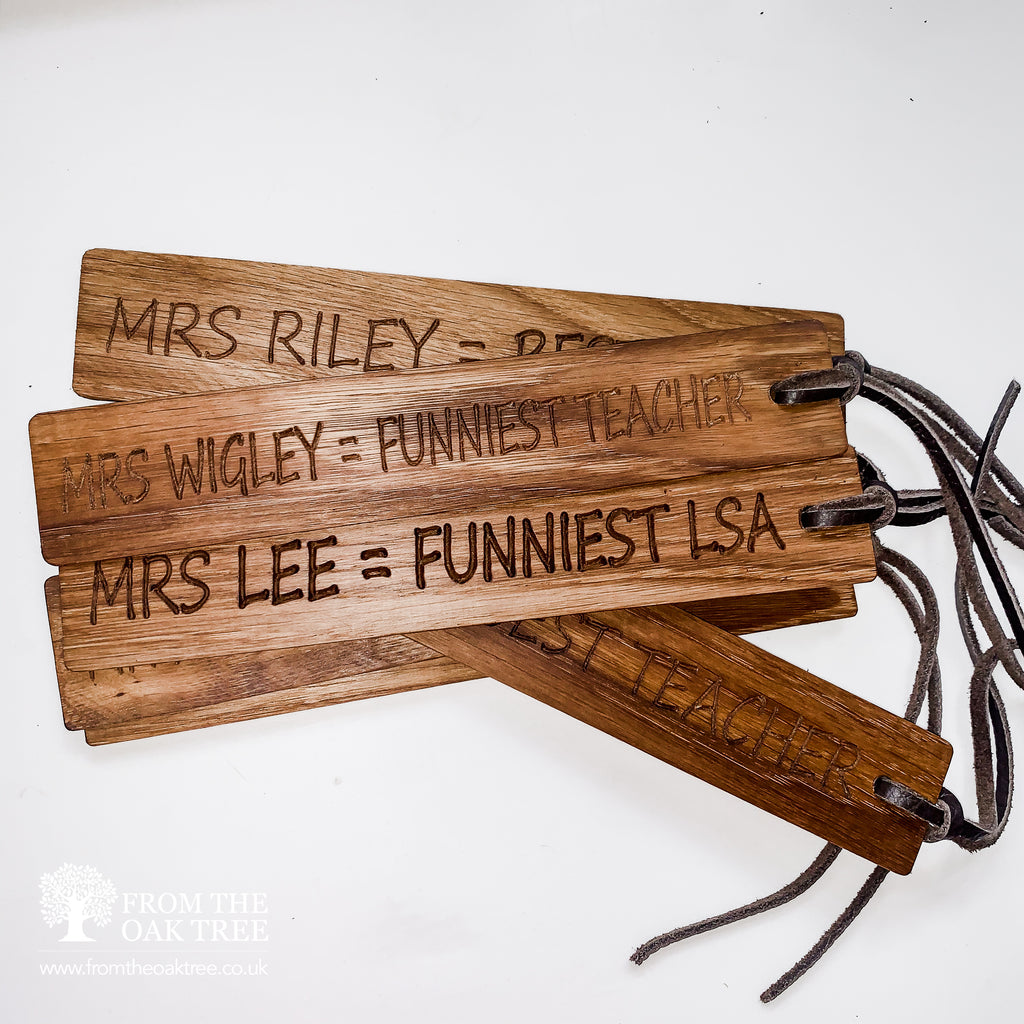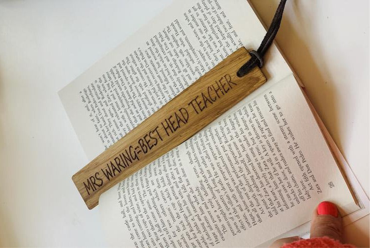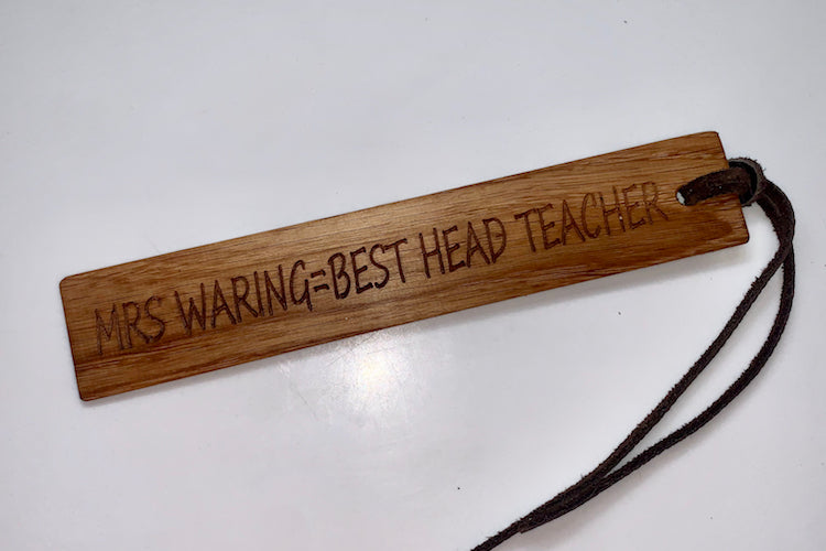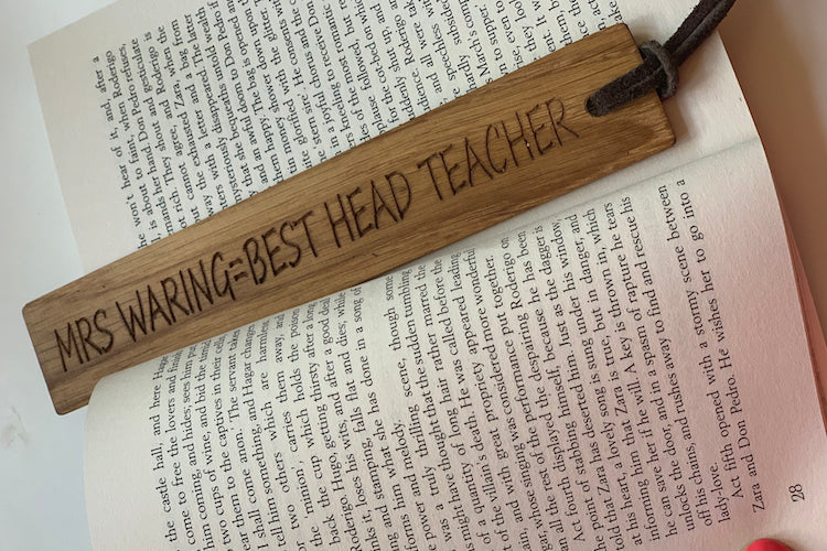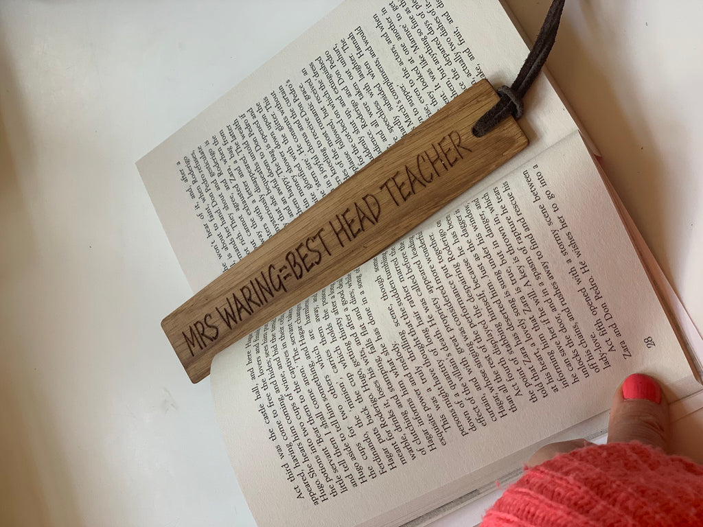 We love our oak book marks just engraved simply with BOOKMARK and personalised with our own choice of words in equal measures.