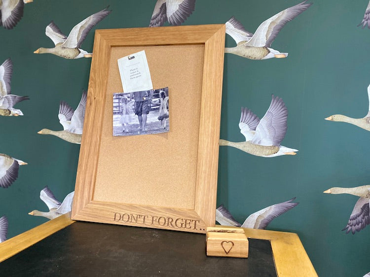 Our gorgeous solid oak notice boards are handmade in our workshop and are all engraved with your own choice of words, using thick cork suitable for most pins and backed with MDF to give a flush finish ready to hand.