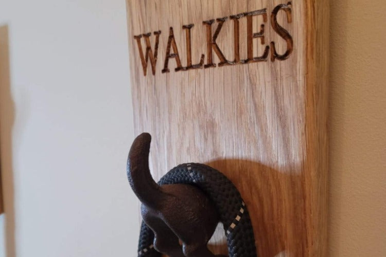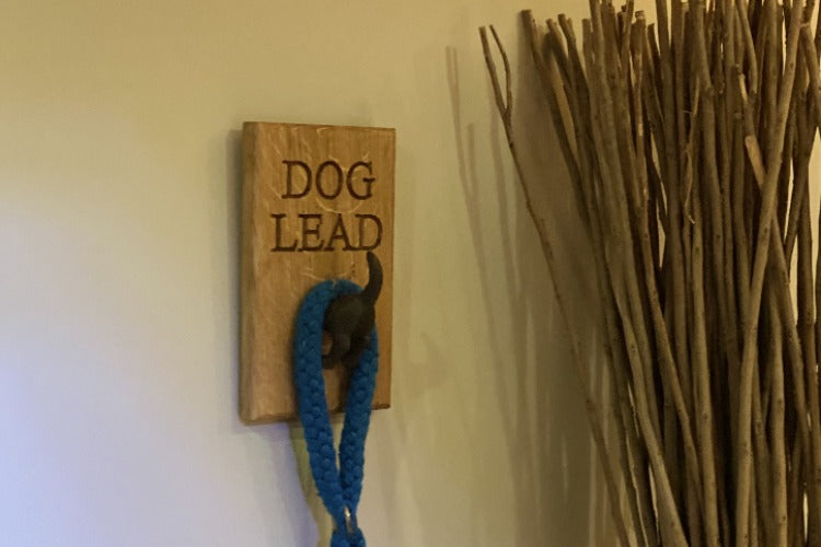 A gorgeous solid oak dog lead hook featuring a beautifully solid cast iron "wagging" tail hook engraved with your choice of words. When you reach for your best friends lead their tail will be wagging with enthusiasm.