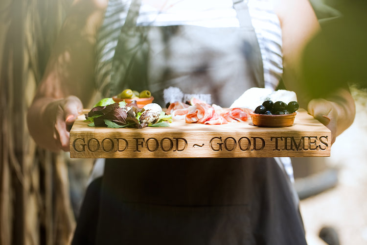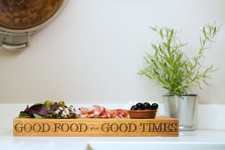 Choose from our board with GOOD FOOD - GOOD TIMES engraved on one side, a blank board or alternatively choose to engrave with your own words.